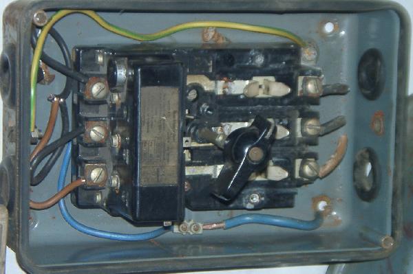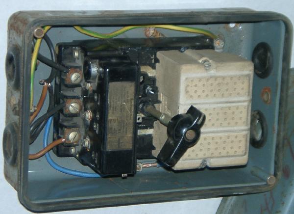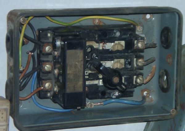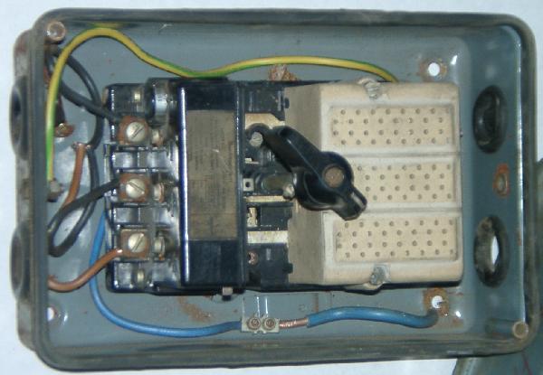 Hier ist der Schalter aufgeschraubt man sieht links den Überstromauslöser im Gehäuse und rechts die Löschkammern